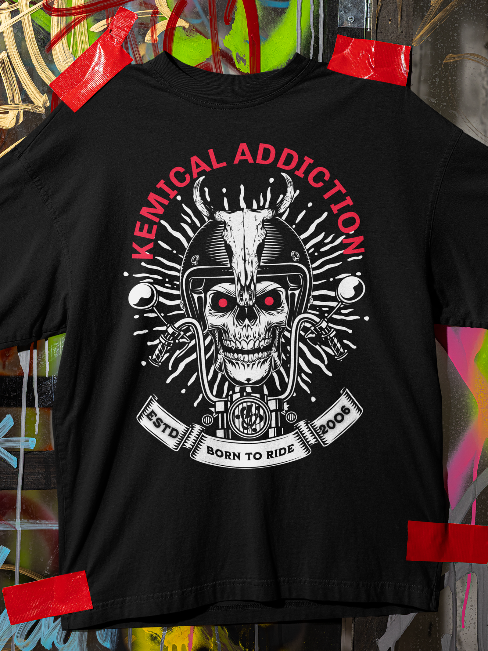 Ride with no limits. The Kemical Addiction Born to Ride graphic tee features a fierce skull and motorcycle-inspired design that represents freedom, rebellion, and raw road attitude. Made from a soft and durable cotton-polyester blend, this shirt delivers comfort, strength, and everyday streetwear performance. Built for those who live to ride and refuse to slow down.
