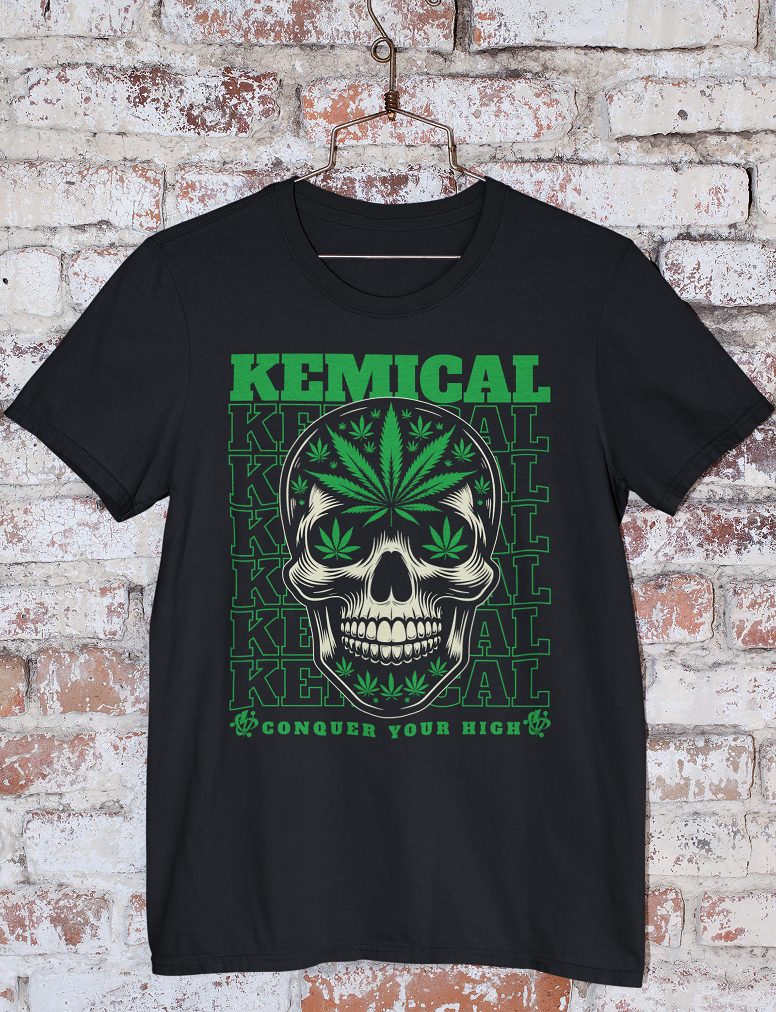 Unleash bold street energy with this Kemical Addiction graphic tee. Featuring a striking skull and cannabis leaf design in vivid green, this shirt delivers hardcore attitude and urban style. Made from a comfortable cotton-polyester blend, it offers a soft feel, durability, and all-day wearability. Perfect for those who live unapologetically and conquer their own high.