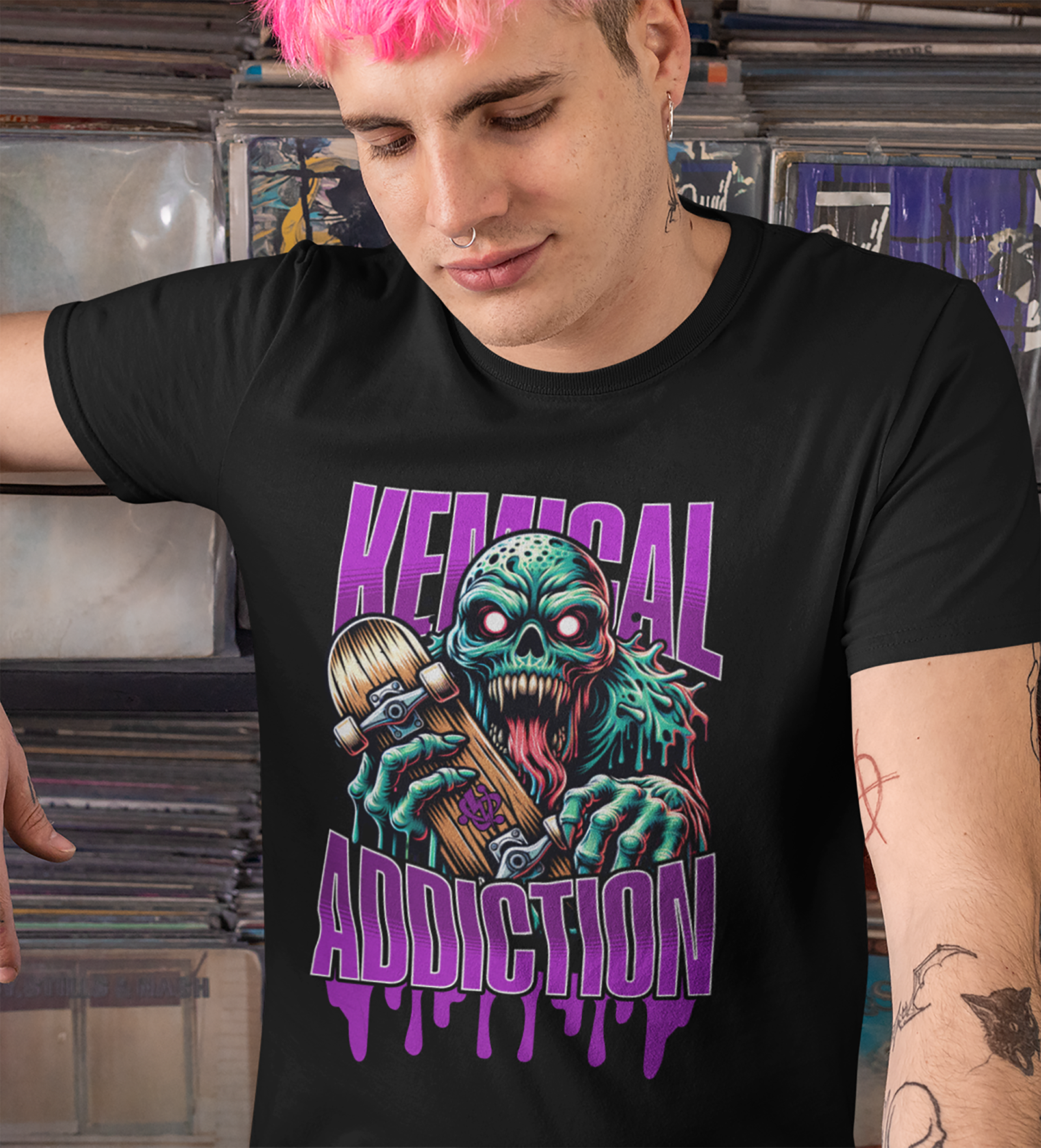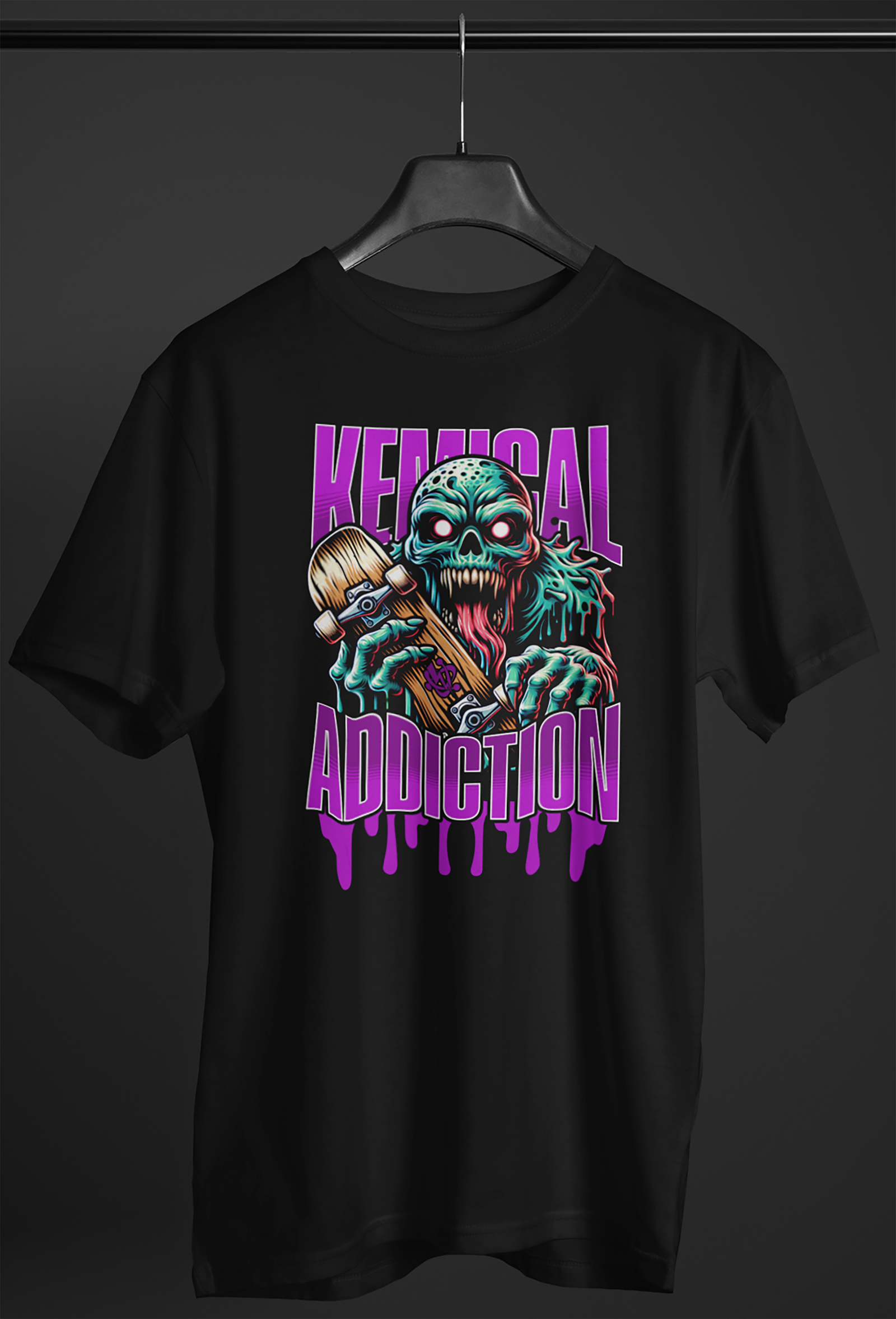 Unleash the chaos with the Kemical Addiction Zombie Skater Tee. Featuring a fierce neon zombie gripping a skateboard, this design explodes with bold purples, electric greens, and dripping street-style typography. Set against a deep black tee, the artwork delivers maximum contrast and hardcore attitude. Built for those who ride fast, live loud, and stay addicted to the chaos.