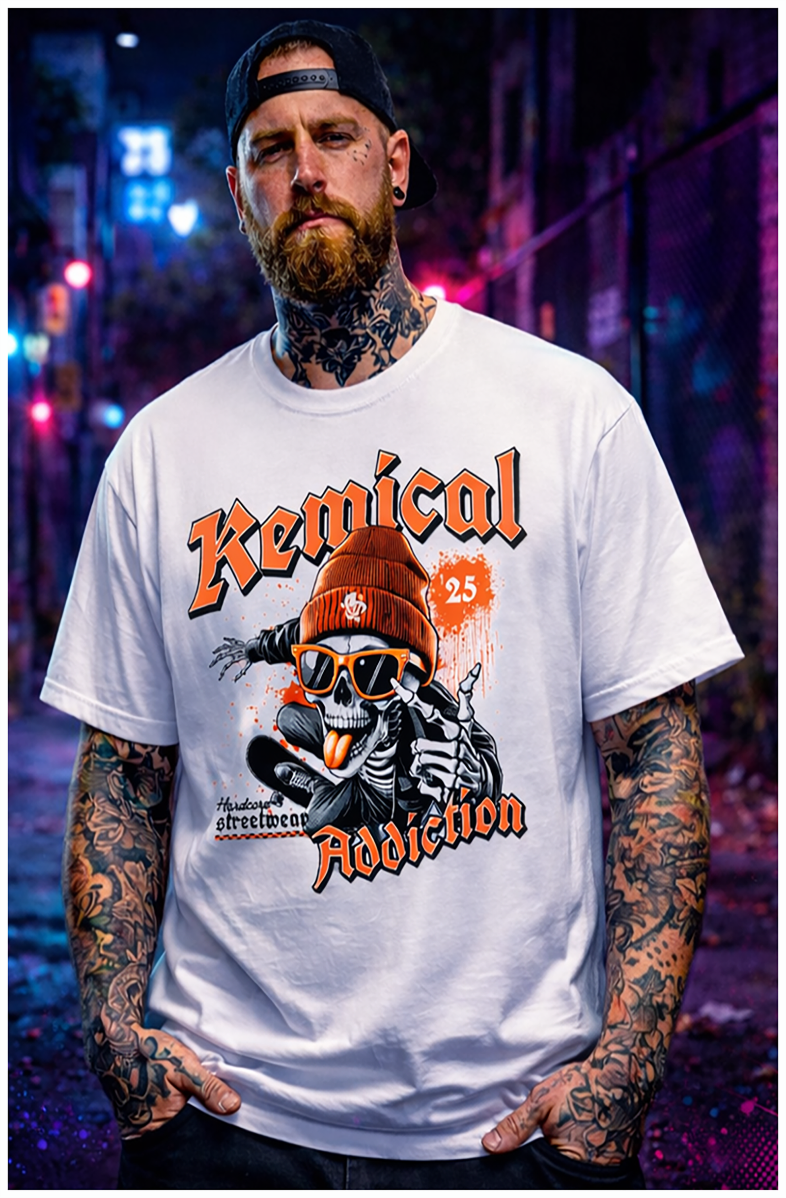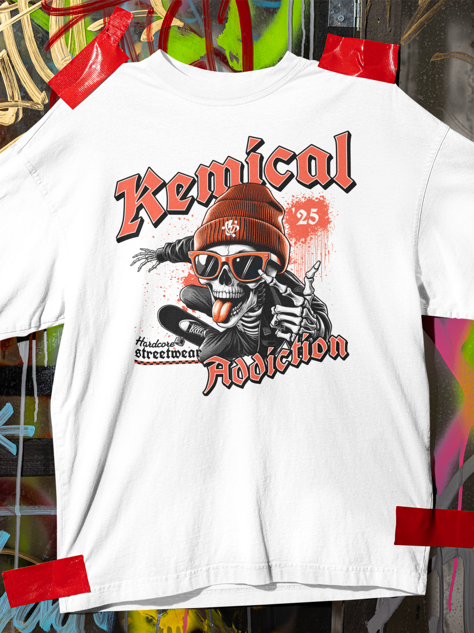 Stand out with this Kemical Addiction streetwear t-shirt, featuring a bold skull graphic with an aggressive urban attitude. Inspired by underground culture and late-night city energy, this design delivers a raw, fearless look made for true streetwear heads. Built with a 50% cotton / 50% polyester blend, it provides all-day comfort, breathability, and long-lasting durability.