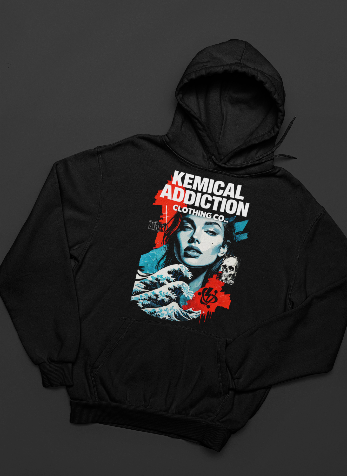 Set against a deep black premium hoodie, the high-contrast artwork delivers that signature Kemical Addiction energy: edgy visuals, urban chaos, and fearless identity. Whether you’re in the streets, at a show, or building your own movement, this hoodie speaks before you do.
